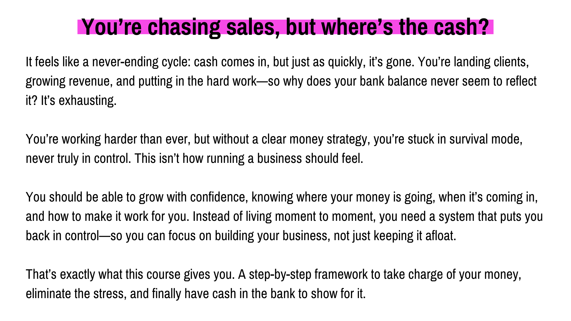 This course isn’t about bookkeeping or tax—it’s about giving you control over your cashflow, so you can make confident, strategic money moves every single day.